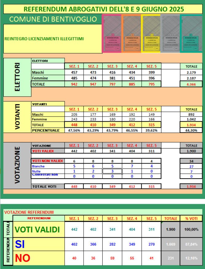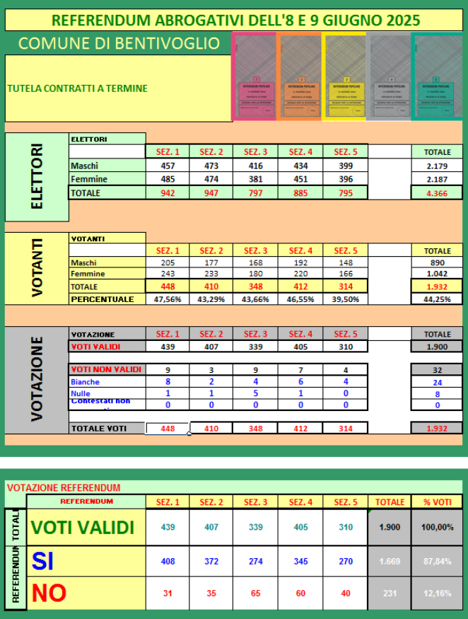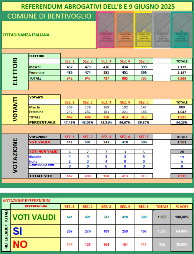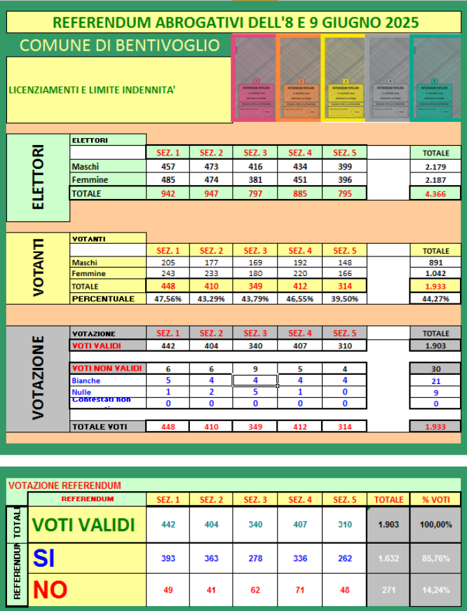 Per visualizzare in tempo reale i dati sull'affluenza ai seggi nelle sezioni del Comune di BENTIVOGLIO e per conoscere i risultati ufficiali a chiusura dei seggi, dalle ore 15.00 di lunedì 9 giugno 2025 per i Referendum abrogativi dell'8 e del 9 giugno 2025, è possibile consultare la pagina dedicata ai risultati elettorali di Bentivoglio oppure il sito "Eligendo".