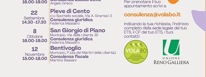 Per prenotare un appuntamento basta scrivere a consulenza@volabo.it e indicare: oggetto della richiesta, sede legale dell’ETS, codice fiscale e i propri contatti.
