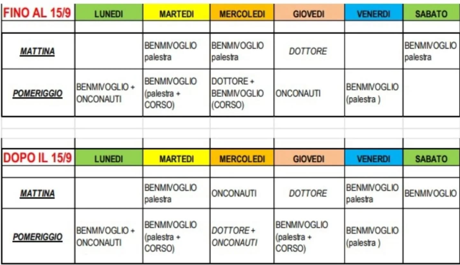 Di seguito troverete la tabella con la distribuzione delle varie attività su settimana.