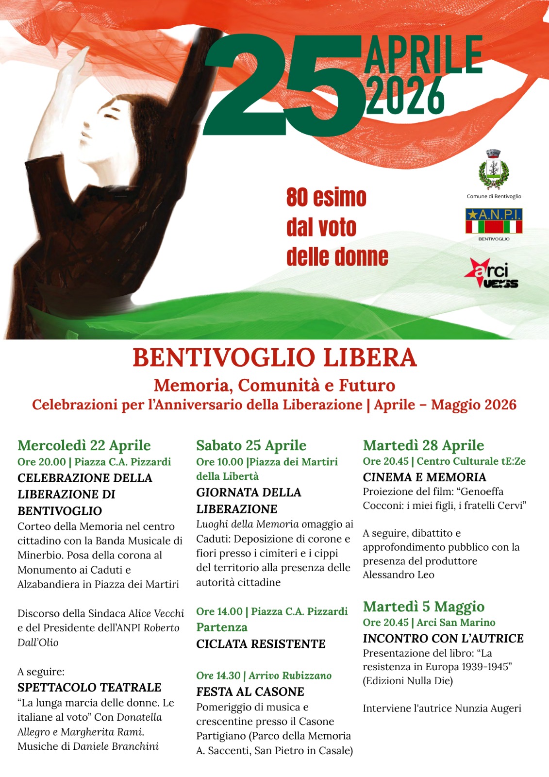 - Mercoledì 22 aprile, ore 20.00– Celebrazione della Liberazione di Bentivoglio: corteo della memoria, discorsi istituzionali della Sindaca e del Presidente ANPI, e spettacolo teatrale “La lunga marcia delle donne”.