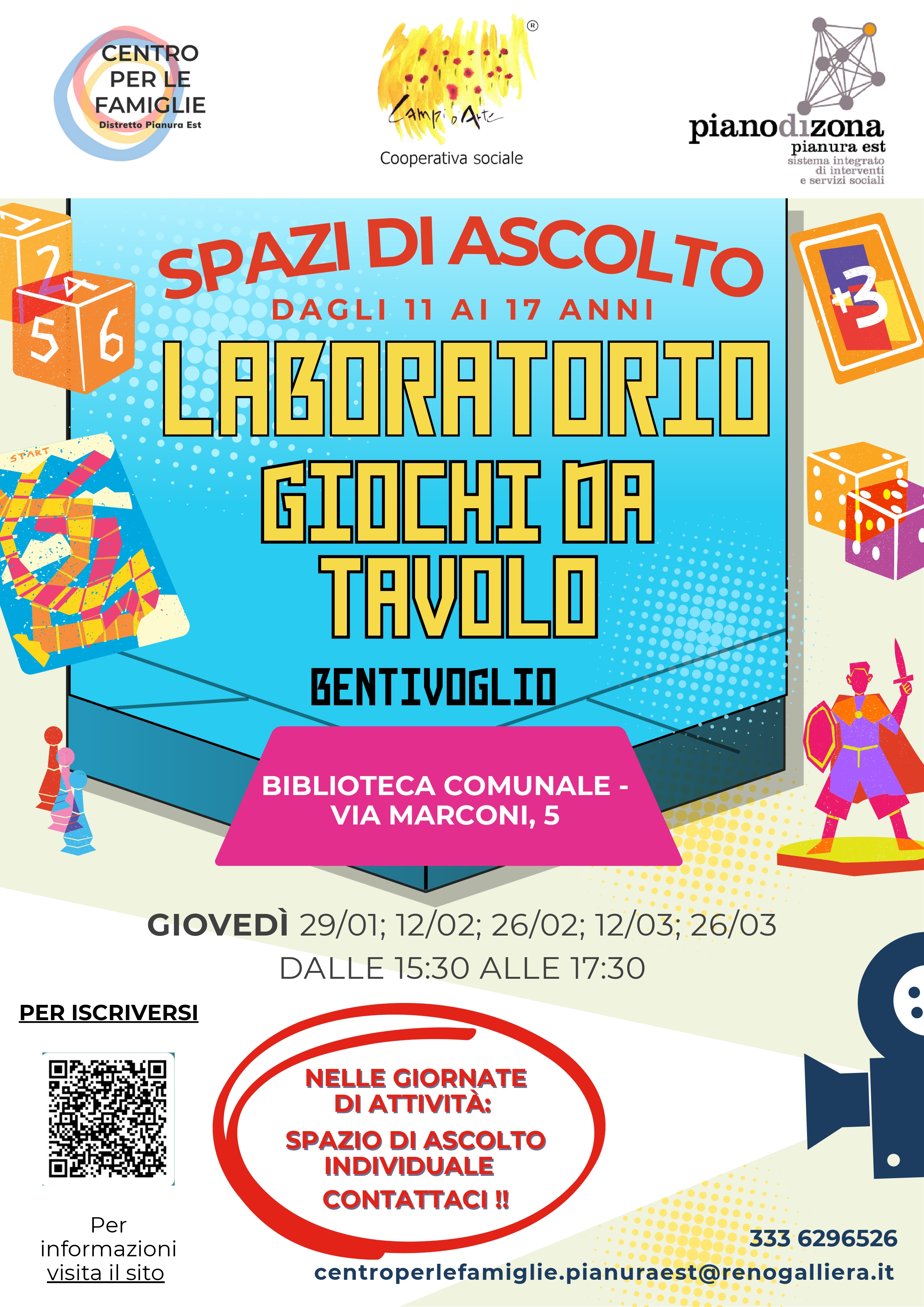 Il Centro per le Famiglie di Bentivoglio propone una serie di attività dedicate a ragazzi e ragazze dai 11 ai 17 anni, con l’obiettivo di favorire il benessere psicologico e il divertimento attraverso il gioco e l’ascolto.